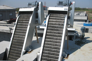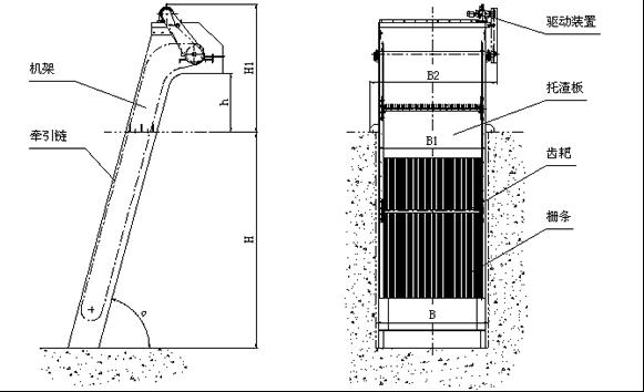 在電動機的驅動下,通過減速機減速后,帶動鏈輪及鏈條運動,固定在回轉鏈條上除污齒耙鏈條在柵后運動到底部,經(jīng)過導輪后翻轉到柵前迎水面的位置繼續(xù)運動插入固定柵條的間隙中上行,把柵前攔截的污物帶出水面,并隨著鏈條的運動到出渣口處自動翻轉,污物自卸到格柵后的輸送機或渣桶中,完成排污過程,液體則通過柵條的柵隙流過,整個工作狀態(tài)連續(xù)循環(huán)進行。