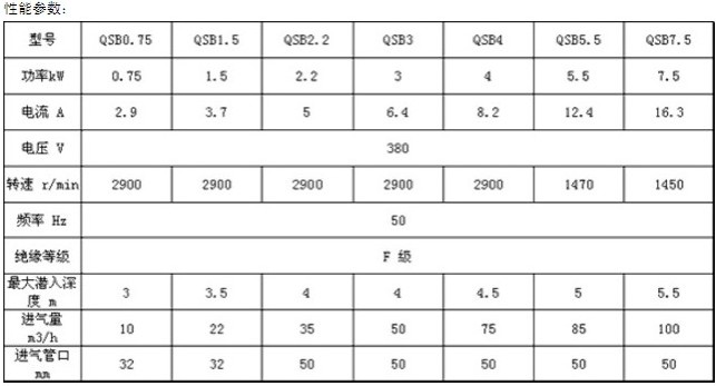 潛水曝氣機的性能參數(shù)表: