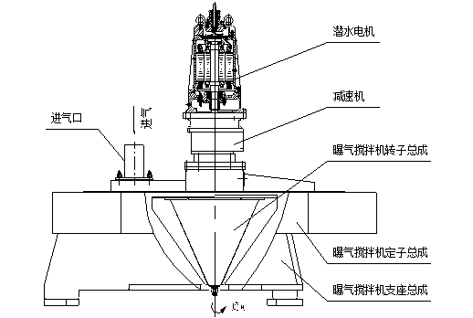 SBJ產品由潛水電機、減速裝置、葉輪、混合室、底座、輸氣管、起吊鏈組成。如圖